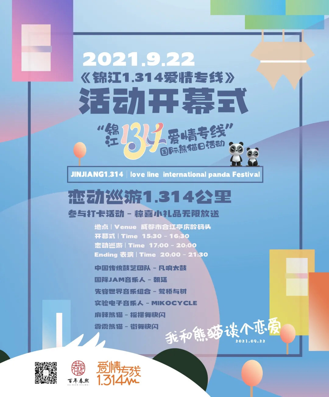 9月22日,锦江区1.314爱情专线,一场浪漫的恋动巡游,一场动人心弦的音乐演出,在肆意流淌的悦耳音符中,大胆表达你的小心思吧,和“熊猫”一起探戈恋爱。