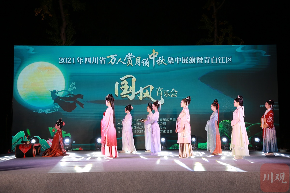 金秋光年、文化盛宴、国风雅韵、琴瑟悠扬。9月19日晚,2021年四川省万人赏月诵中秋集中展演暨青白江区国风音乐会在成都青白江凤凰湖汉唐街举行。