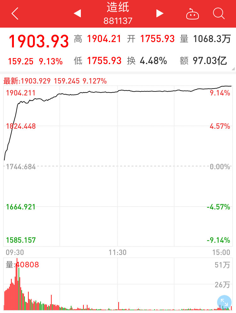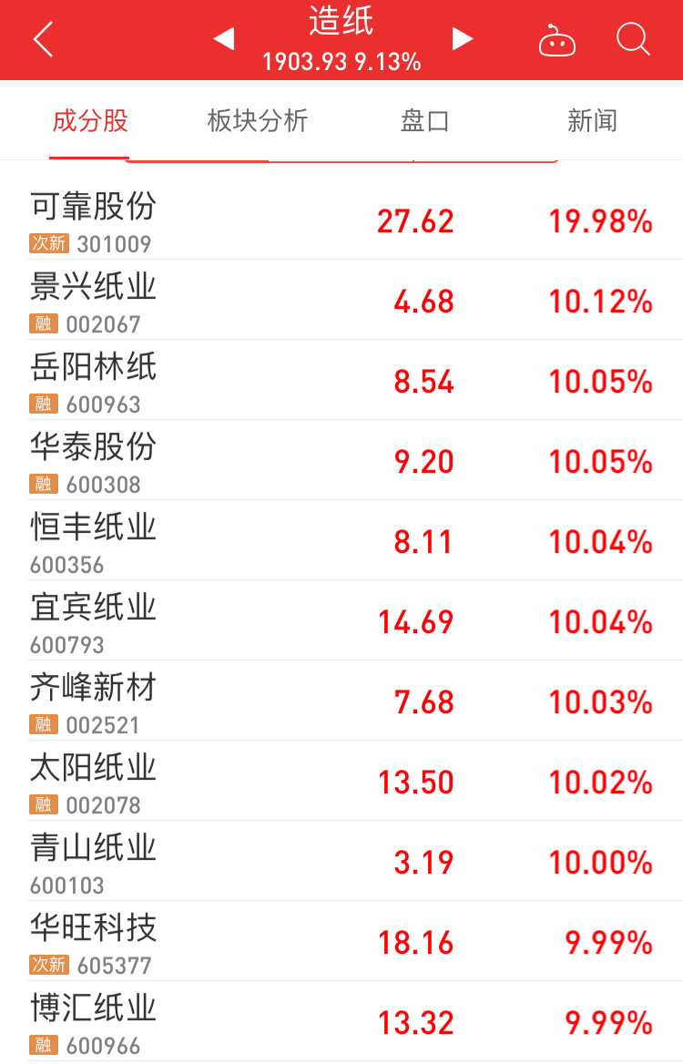 随着开学季、中秋节和国庆节陆续来临,造纸行业迎来“文化纸旺季”,A股造纸板块近日不断走强。今日,受涨价消息提振,造纸板块早盘掀起涨停潮,太阳纸业、青山纸业等数十只个股批量涨停。川股中,宜宾纸业涨停,报14.69元。