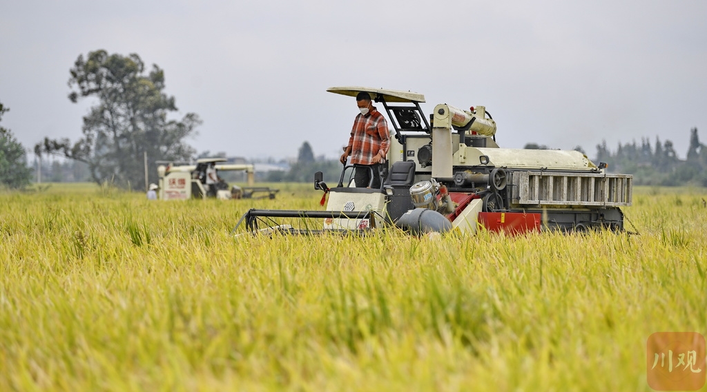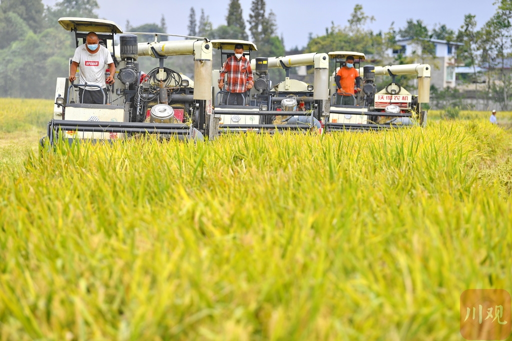 9月23日,中国农民丰收节(四川)群众联欢活动现场在广汉市三星堆镇三星村举行。当日,记者在广汉市高坪镇金九村看到,一台台收割机在金灿灿稻田里来回穿梭,一片片沉甸甸的稻穗被“吞”进收割机的嘴里,又从“嘴”里吐出黄澄澄的稻谷,现场一片丰收的景象。