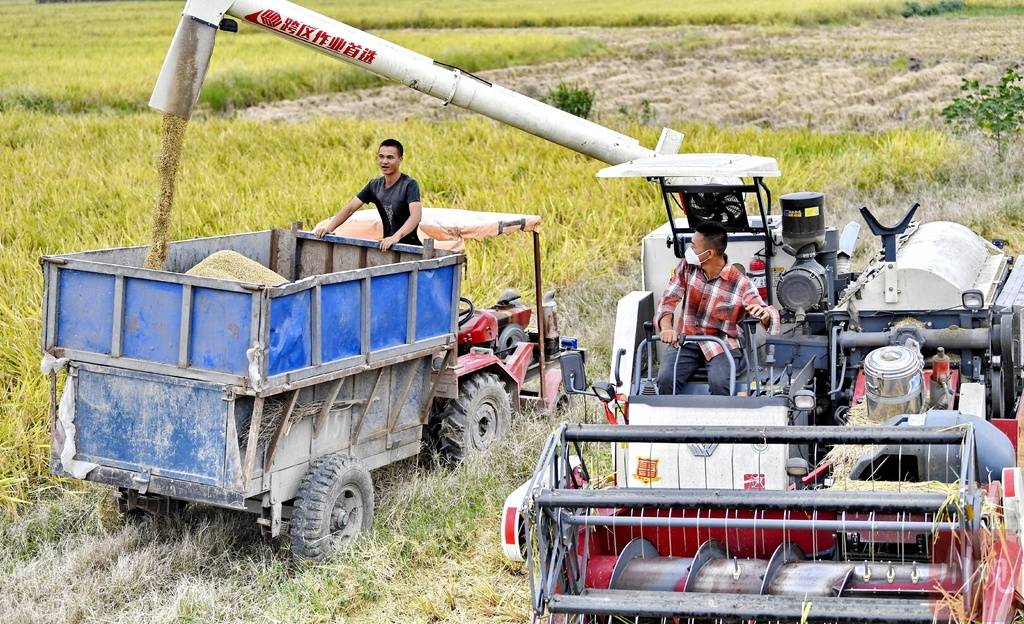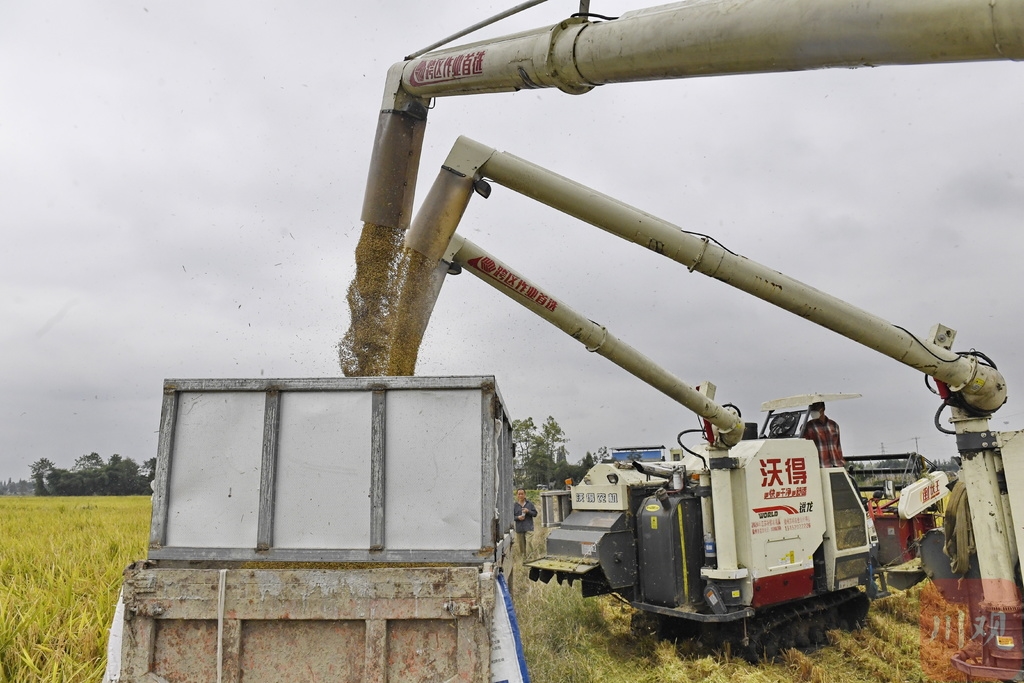 9月23日,在广汉市高坪镇金九村,当地政府组织收割机抢收成熟的稻谷。