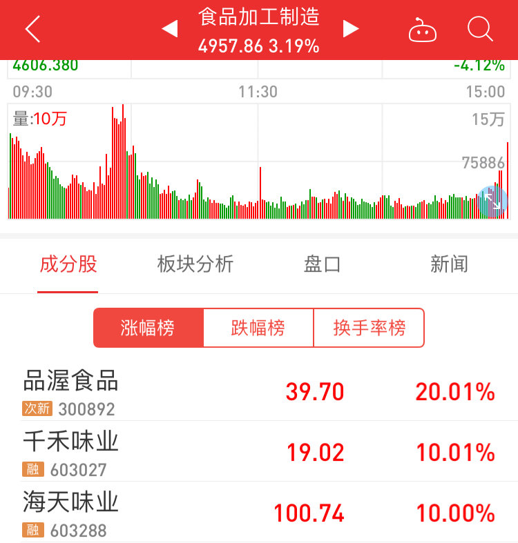 “调味品”板块的走高,和“酱茅”海天味业的提价传闻不无关系。今日早盘,海天味业股价直奔涨停,达到100.74元/股,总市值4243.75亿元。