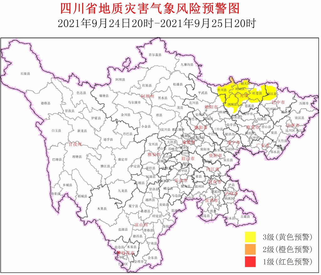 9月24日,四川省地质灾害指挥部办公室根据四川省地质环境条件,结合四川省气象台天气预报情况,发布地质灾害气象风险黄色预警:9月24日20时至9月25日20时,广元利州区、朝天区、昭化区、旺苍县、青川县、剑阁县、苍溪县,巴中南江县,绵阳江油市等3市9个县(市、区)进入预警范围。