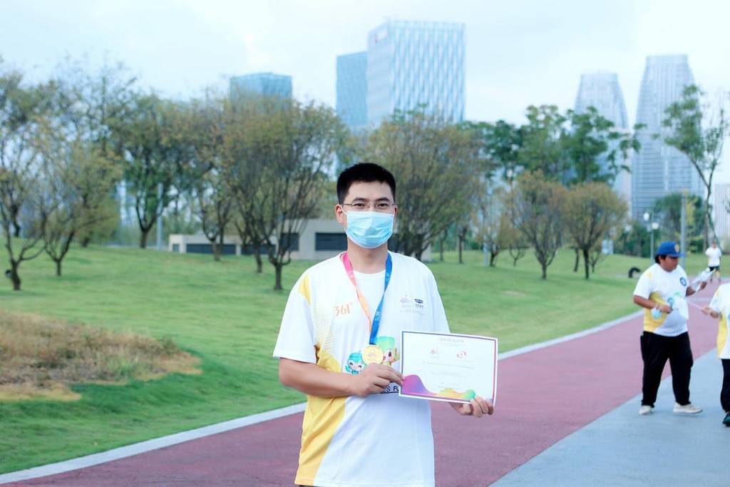 傍晚,第二场活动亚运UP(趣味跑)活动在成都交子公园进行,交子公园作为公园城市建设的示范标杆,成都CBD网红打卡新地标,具有较强的群众吸引力。在前中国国家体操队队员、世界冠军、奥运冠军冯喆带领下,跑迷们群情振奋,200名统一着杭州亚运会文化衫的跑友参加开跑仪式。