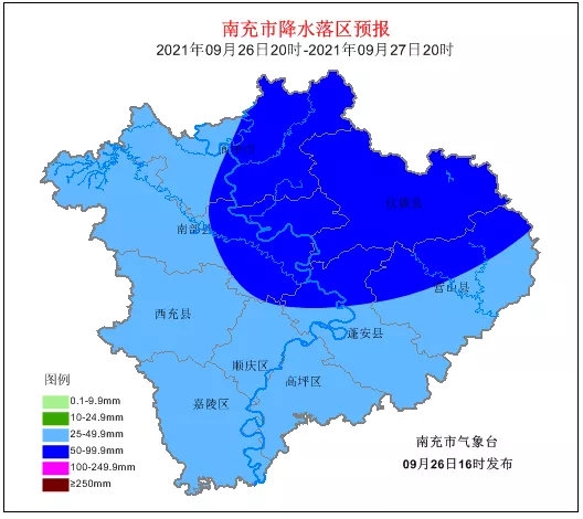 9月26日16时31分,南充市气象台发布暴雨蓝色预警:预计26日20时到27日20时,南充市有一次雷雨天气过程,强降雨主要集中在26日夜间,全市大部地方大雨到暴雨(40-70mm),过程中伴有短时强降水和阵性大风。同时嘉陵江上游地区(广元)已出现持续性强降雨天气过程,请注意防范强降雨引起的中小河流洪水、地质灾害、城镇内涝等气象次生灾害。