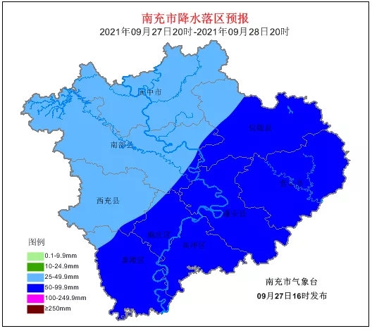 9月27日16时,南充市气象台继续发布暴雨蓝色预警:预计今天夜间,市辖三区、仪陇、营山、蓬安有大雨到暴雨(40-80mm),个别地区雨量可达100mm以上,其余地区中雨到大雨,过程中伴有短时强降水和阵性大风。请注意防范持续性强降雨可能引起的中小河流洪水、地质灾害、城镇内涝等气象次生灾害。