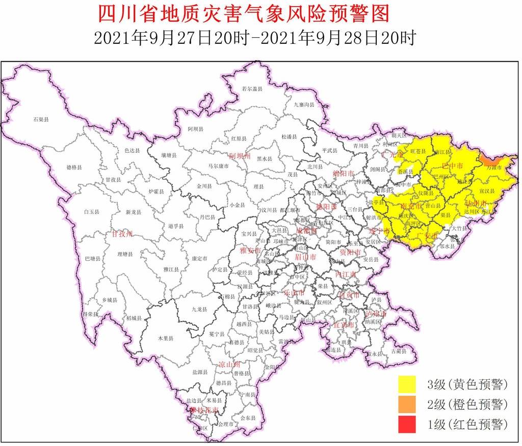 9月27日,四川省地质灾害指挥部办公室根据四川省地质环境条件,结合四川省气象台天气预报情况,发布地质灾害气象风险预警:9月27日20时至9月28日20时,达州万源市进入橙色预警范围,另有7市34个县(市、区)进入黄色预警范围。