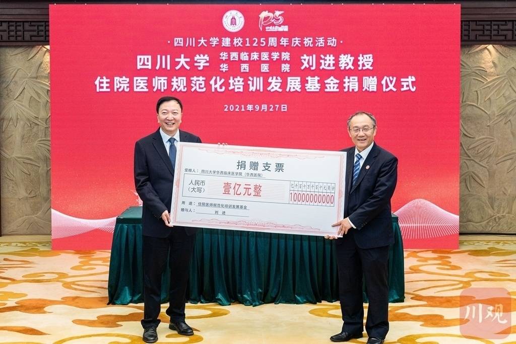 9月27日下午,四川大学举行“刘进教授规范化培训发展基金捐赠仪式”。四川大学华西医院麻醉手术中心主任刘进教授向医院捐赠1亿元,设立规培专项基金,用于激励住院医师、带教师资,提高住院医师临床能力,这也是我国首个由个人捐赠设立的专项规培发展基金。