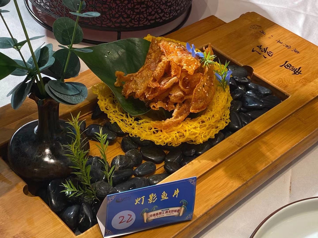 “灯影鱼片造型非常独特且具有一定艺术性,鱼片肉质细腻鲜美,这种烹饪技巧值得我们学习借鉴。” 现场参赛厨师交流议论,互相取经。大厨们大显身手,各色菜品花样造型繁多,烹制手法新奇富有创意。黑米香酥脆肉、龙眼肉、葫芦乳鸽、灯影鱼片等一道道别致的大餐吸引了大家的目光。
