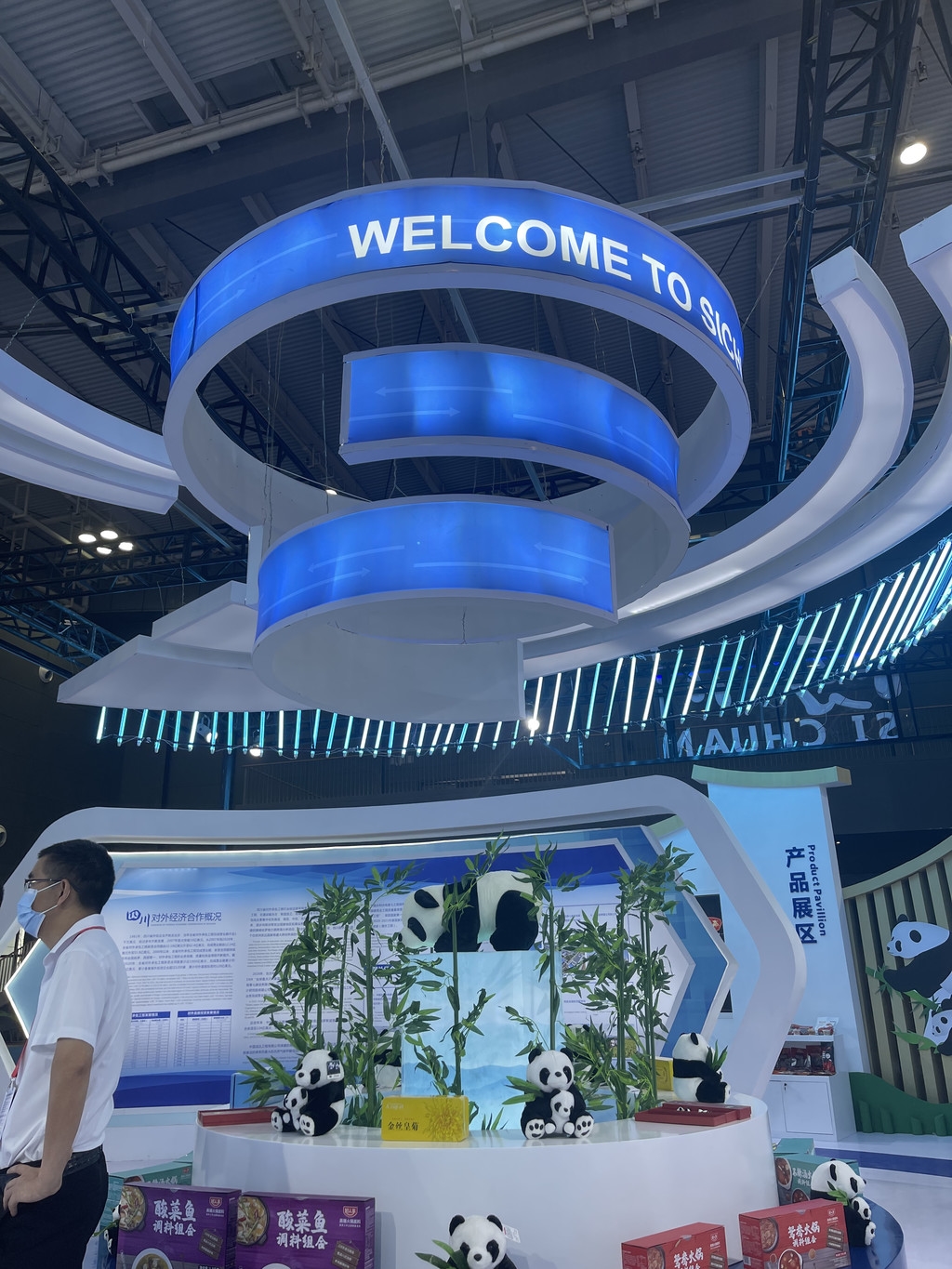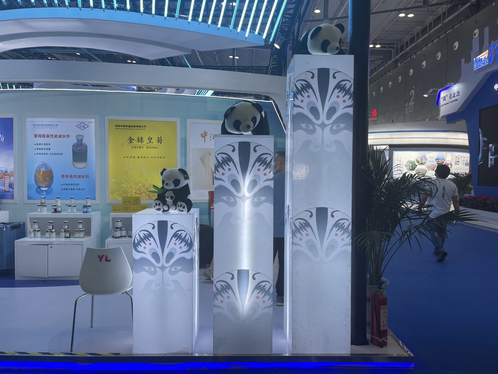 在展馆一侧的装饰灯柱上,则印着川剧脸谱的图案,灯柱上还趴着一只只可爱的熊猫玩偶,瞬间将“最四川”的氛围感拉满。