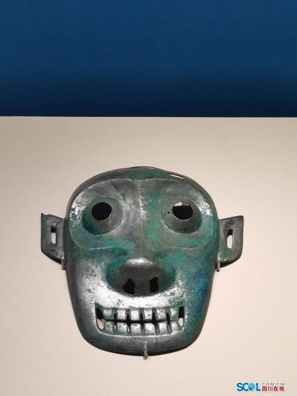 看了三星堆的面具,再来看城固发现的面具,有没有发现异同之处?这件面具额部有两穿孔,眼部微凹,中部凸起,圆孔,两耳菱形,中有穿,鼻有两孔,裂嘴露齿,上下牙齿,排列整齐,有隙,体较厚重,牙齿处漏铜,器型独特,地方特色明显,是研究城固青铜器发展变化的重要实。