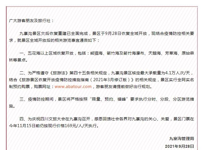 9月28日,九寨沟景区全域恢复开放。九寨沟景区管理局官方微信号当天发布《九寨沟景区全域开放通告》,为庆祝四川文旅大会在九寨沟召开,感恩回馈社会各界对九寨沟的关心、关爱,景区门票在今年11月15日(旺季)前仍按现行价格169元/人/天执行。