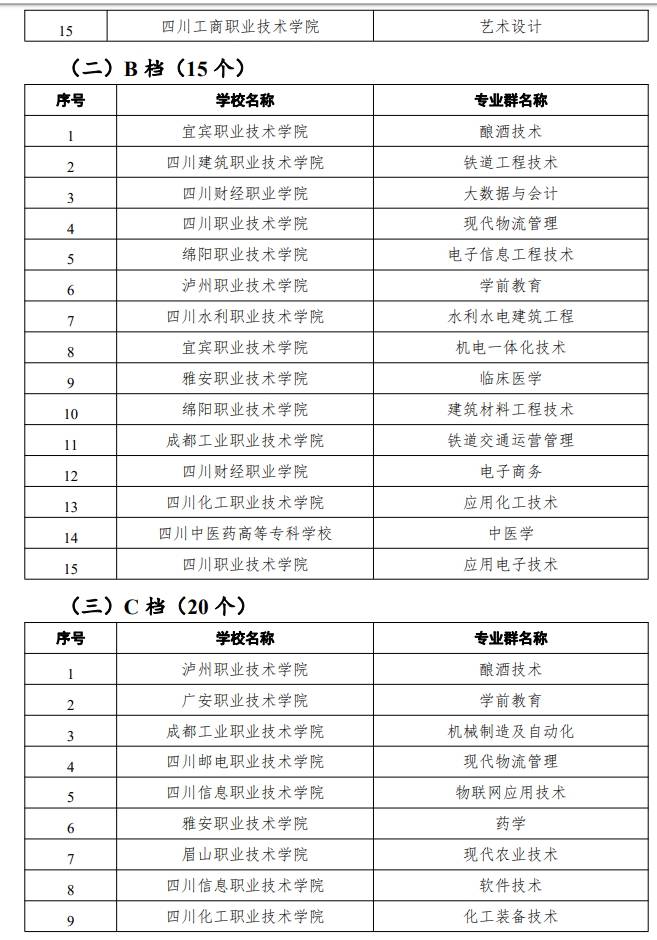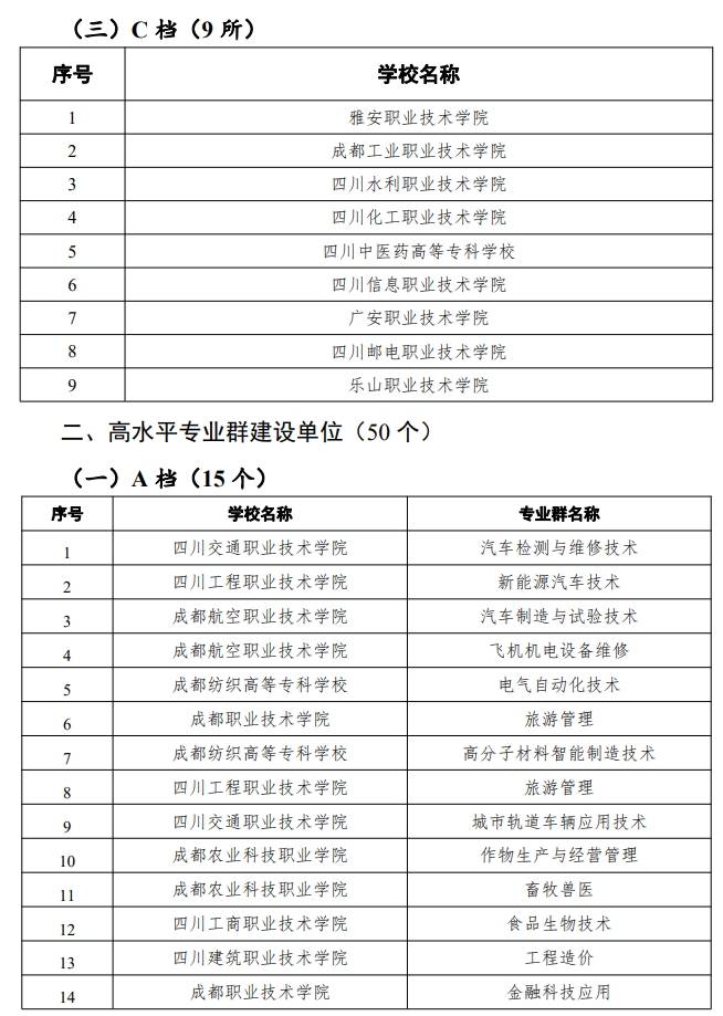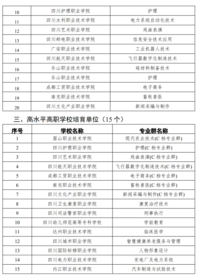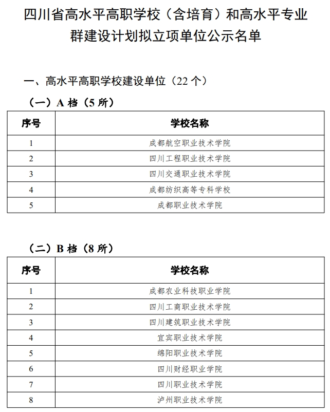 为贯彻落实《四川省职业教育改革实施方案》,根据四川省教育厅、四川省财政厅《关于实施四川省高水平高等职业学校和高水平专业群建设计划的意见》(川教〔2021〕24号)和《关于开展四川省高水平高等职业学校和高水平专业群建设计划项目申报的通知》(川教函〔2021〕86号)要求,按照公平公正、扶优扶强、质量为先、改革导向、合理布局的原则,经高职学校自愿申报,专家组对申报项目进行网络评审、会议评审,教育厅、财政厅审定,拟立项建设22所高水平高等职业学校(含8所“国家双高”建设学校)、50个高水平专业群和15所高水平高等职业培育学校,现予公示。公示时间:2021年9月28日至10月9日(5个工作日)。