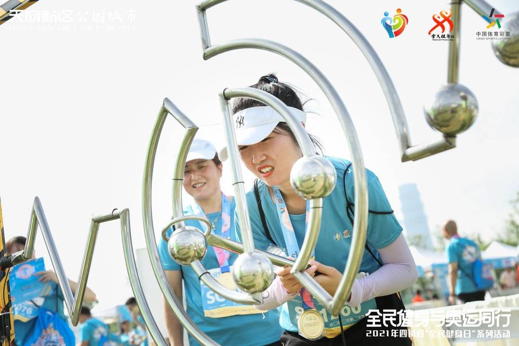 今天举行的体育嘉年华活动,是2021年四川省“全民健身日”的“压轴戏”。依托天府公园丰富的绿道资源,广大群众在2公里的绿道上欢乐跑,享受运动的乐趣,感受天府新区公园城市魅力。除了欢乐跑,参与嘉年华的市民还有可以现场领取趣味通关卡,参加棒垒球、眼疾手快、骑自行车榨果汁、射箭、迷你高尔夫、健身魔镜等趣味运动体验,兑换运动周边纪念品;借助VR设备和道具,体验滑雪、滑冰、冰雪滑板等项目带来的冬季运动快乐。还可在平板支撑、俯卧撑、跳绳三个项目中与大家进行体能PK赛,优胜者还将获得奖励。在运动后,还能来特色美食体验区,享用美味的钵钵鸡、咖啡、甜点等美食。