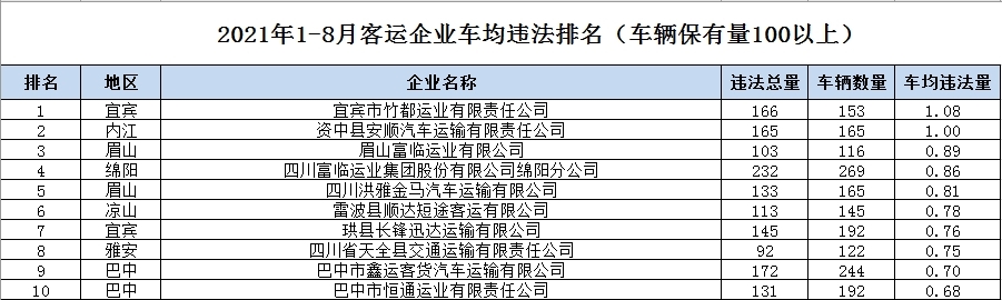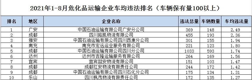 记者9月28日从四川省公安交警总队获悉,省交警总队公布了今年1月至8月重点违法企业名单,具体涉及有客货运企业、客运企业、货运企业、危化品运输企业。其中,客货运企业车均违法排名(车辆保有量100以上)中,中国石油运输有限公司广安分公司违法总量达370次,以车均违法量2.40排名第一。