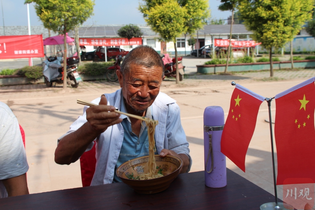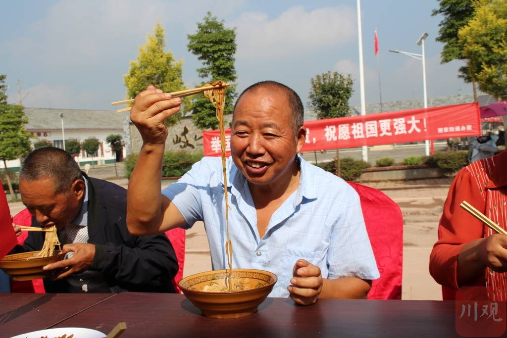 9月29日,眉山市彭山区谢家街道岐山村组织该村脱贫村民免费吃“国庆面”,赢得村民纷纷赞叹。当天一大早,谢家街道岐山村的乡厨就开始忙碌,油酥花生米、炒肉臊子、煮面条……“有点忙,但是非常高兴,庆祝祖国的生日。”