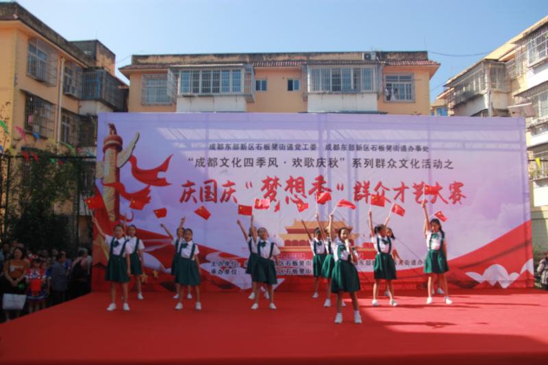 9月29日,成都东部新区石板凳街道新农村综合体篮球场一片欢腾。由该街道党工委办事处主办,街道民生服务办、工会联合会承办的以“成都文化四季风·欢歌庆秋”系列群众文化活动之庆国庆“梦想秀”为主题的群众才艺大赛欢乐上演。