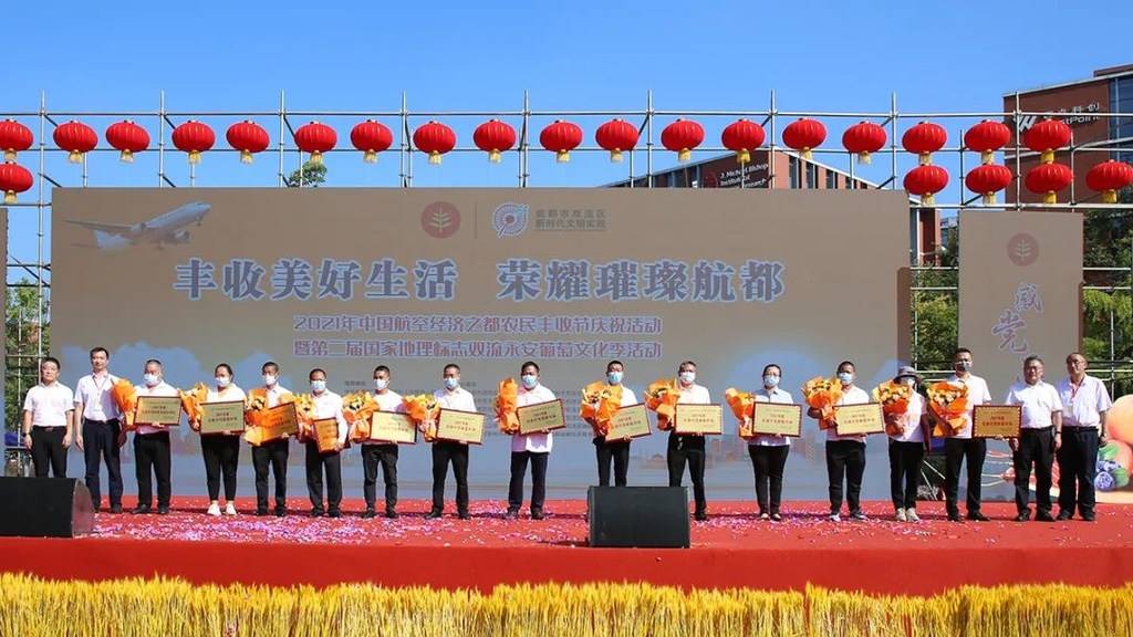 9月29日,2021年中国航空经济之都农民丰收节庆祝活动暨第二届国家地理标志双流永安葡萄文化季活动在天府国际生物城文化中心举行。