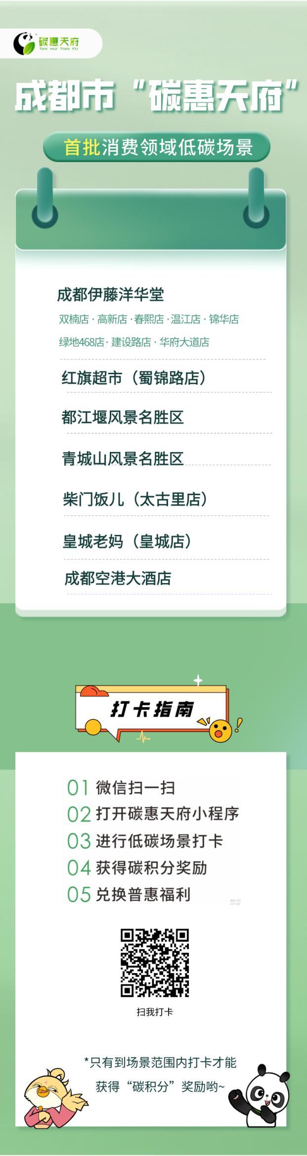 本次公布的低碳消费场景包括红旗超市(蜀锦路店)、成都伊藤洋华堂(双楠店、高新店、春熙店、温江店、锦华店、绿地468店、建设路店、华府大道店)等商超场景,都江堰风景名胜区、青城山风景名胜区等景区场景,柴门饭儿(太古里店)、皇城老妈(皇城店)等餐饮场景,以及成都空港大酒店等酒店场景。现在,市民只需在以上低碳场景内消费,并通过微信扫描“碳惠天府”线下标识打卡,就能获取“碳积分”奖励,用于“碳惠天府”小程序中兑换相应的普惠福利。