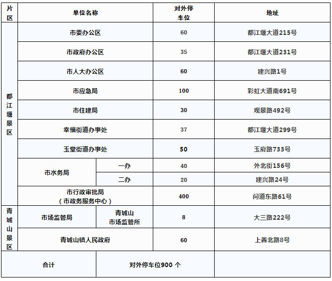 9月30日,四川在线记者从都江堰市获悉,国庆假日期间(10月1日至7日),都江堰市将向游客免费开放党政机关单位停车场,共计900个停车位。