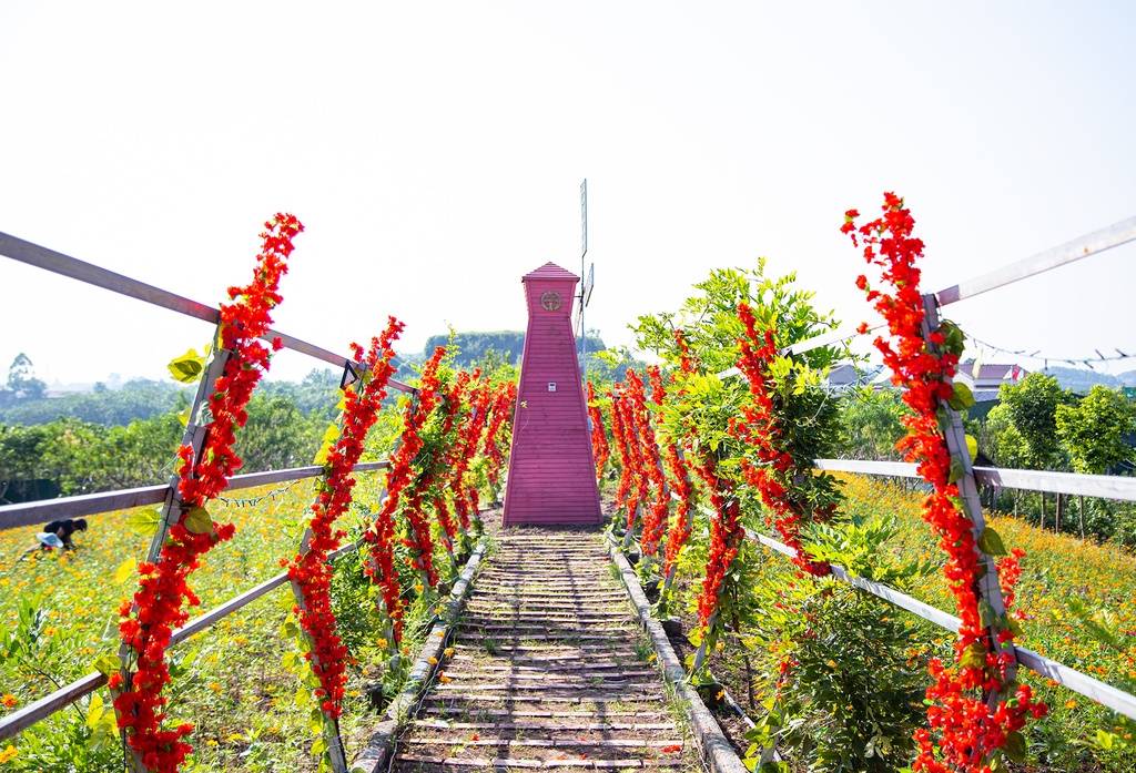 此时,公园内的硫华菊已盛开了4成左右,在阳光与微风的拥抱下飘飘摇摇,肆意舞蹈。其间,百日草五颜六色相互映衬,道路两边的彩绸随风起舞。
