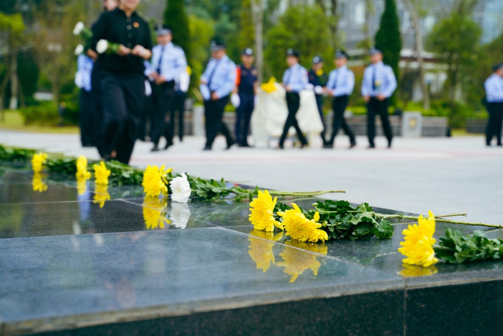 松柏含翠祭先烈,鲜花垂泪寄哀思。10时整, 公祭仪式开始,全场齐唱中华人民共和国国歌。国歌唱毕,全体人员肃立脱帽,向公安英烈默哀,寄托深切哀思。最后,伴随着深情的《献花曲》,全体人员依次瞻仰公安英烈墙并敬献鲜花。
