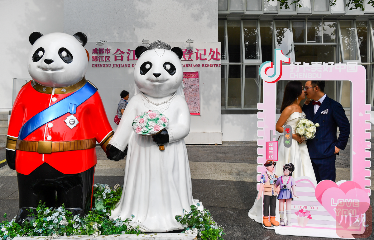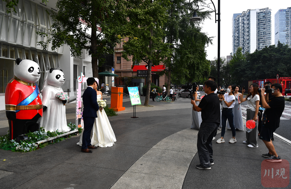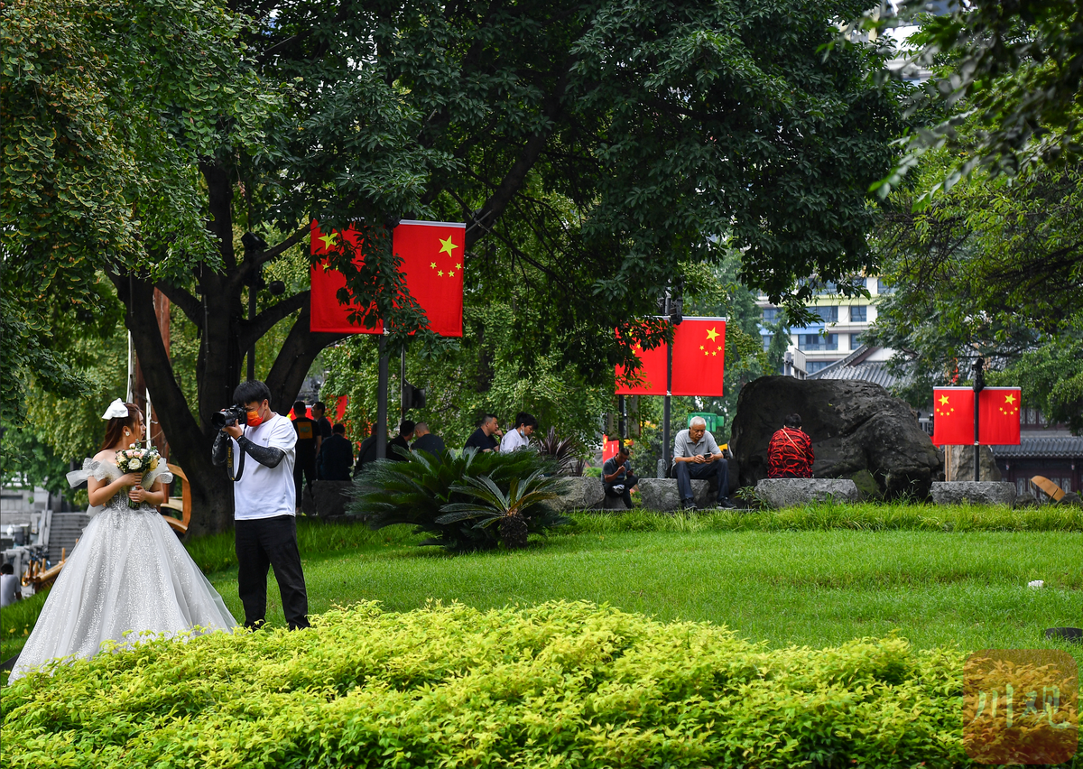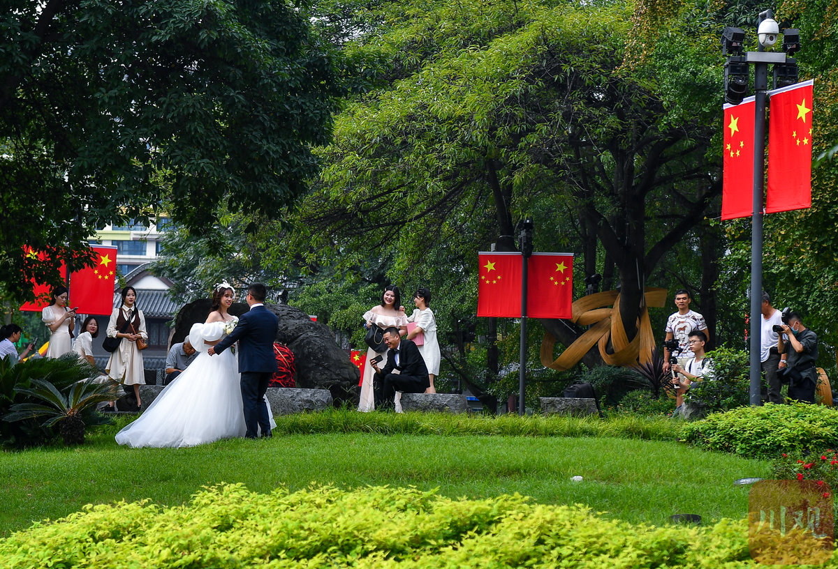 10月1日,一大早,扎着鲜花的婚车,载着一对对幸福的新人来到成都市锦江边上的合江亭。“今天国庆节,我们结婚了!”新人们牵着手,走过爱情斑马线,在合江亭边许下心愿。多对新人特别把婚礼选在了国庆当天,目的是为了留下特别的纪念。