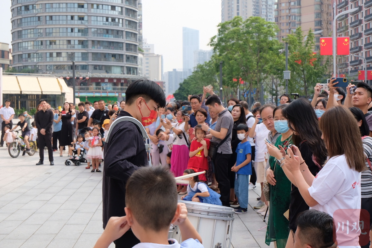 开放日现场,四川音乐学院的学生们身着中国风的古雅红白衣裳,在广场前敲起大鼓,鼓声由弱渐强,英姿飒爽。紧接着,交响乐《走向复兴》《歌唱祖国》声声入耳,金黄色的小号大号在阳光下齐鸣,不少市民跟着旋律轻轻哼唱。随后不少市民们拾级而上,走进成都城市音乐厅内体验,一场场免费小型音乐现场令人目不暇接,大家跟着音乐“赶场”起来。