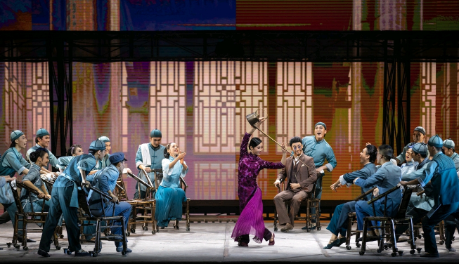 在舞台美术方面,青瓦木门的餐馆中,几把巨型竹制藤椅贯穿整个舞剧,川剧戏台、红筷土碗及各式川菜、火锅…还有从淫雨霏霏到“太阳出来喜洋洋”的场景设置,以及“亮嗓子”的变脸绝活和川剧“戏中戏”,乃至音乐中的巴蜀元素,甚至第四幕“努力餐血战到底”使用四川方言rap的念白…这一切无一不时刻提醒现场观众,故事发生的真实历史空间就在此处——成都。甚至这种浓郁的、随处可见的巴蜀元素叠加,让作品不自觉地极力传递出一种“天府生活美学”。从传播学的视角来看,这种充满着烟火气的“在地化”的表达,着意于使受众产生共情的效果,进而达成传播效果。