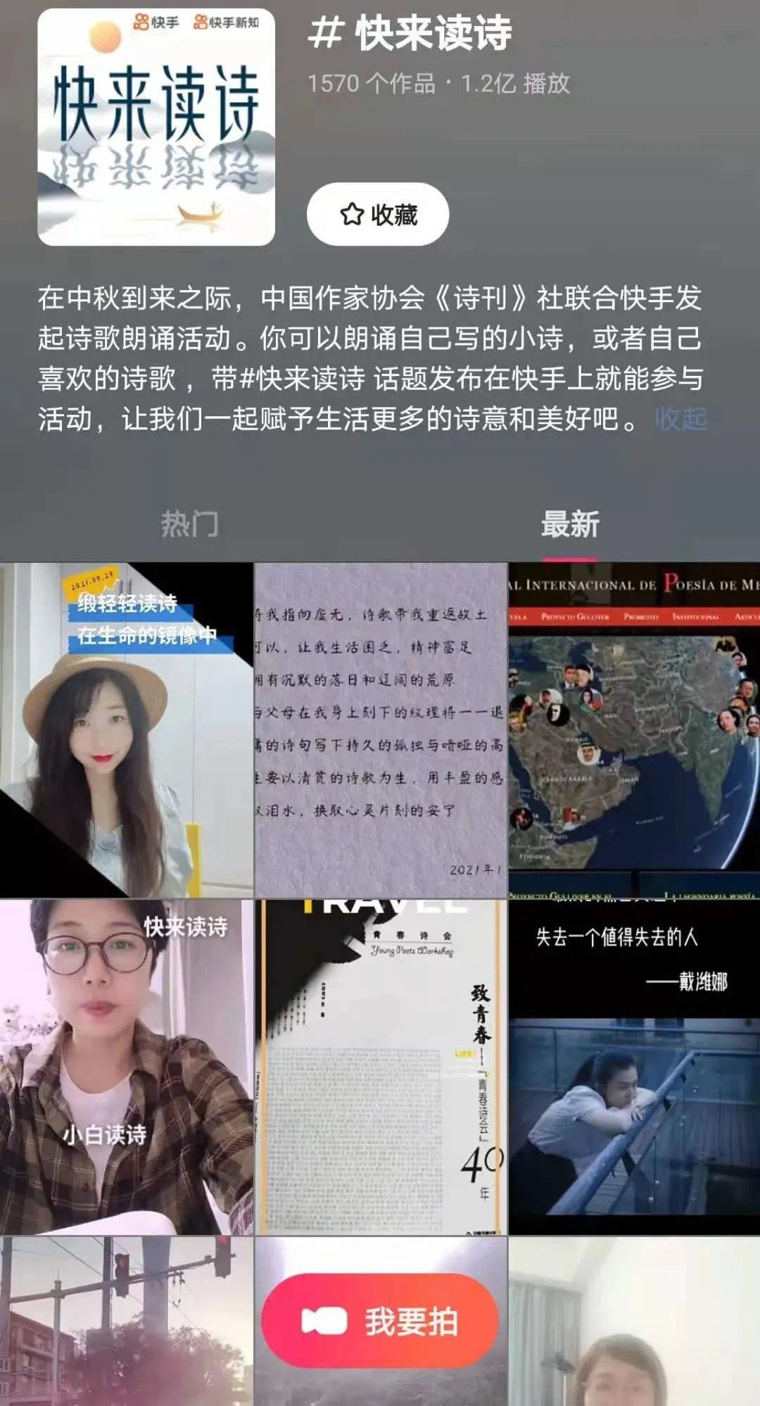 今年9月以来,《诗刊》与快手已先后联合推出“快来读诗,一起过中秋”诗歌朗诵活动、“快来读诗,一起读《诗刊》”诗歌朗诵活动等诗歌朗诵活动。
