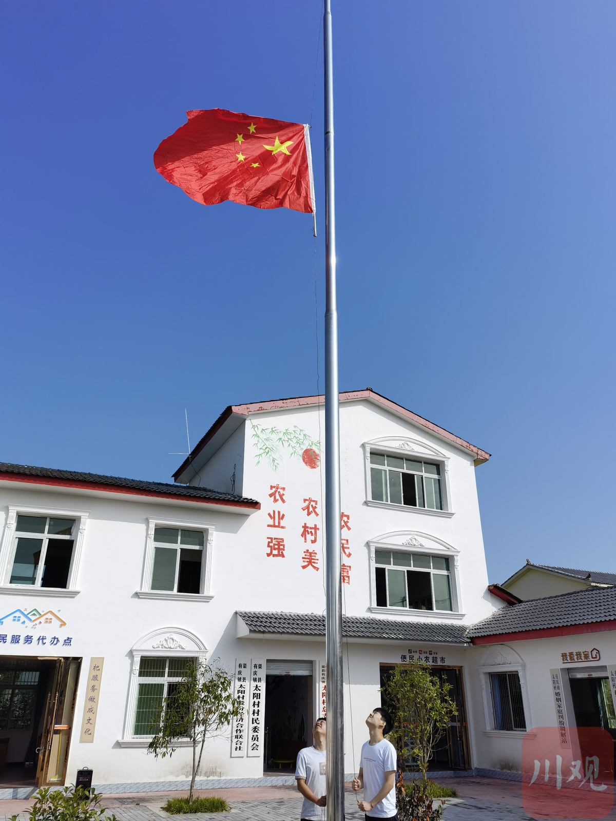 伴着《中国人民解放军进行曲》,村民、学生挥舞着手中的红旗,等待庄严的升国旗仪式。当雄壮的国歌响起,全体肃穆,村民向国旗行注目礼、学生举起右手向国旗敬礼,大家眼神中饱含深情,表达最崇高的敬意和对祖国的美好祝愿。