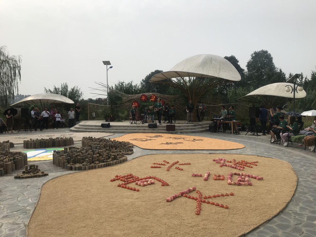 活动现场,一颗由食物组成的“零碳地球”图案亮相。铁牛村8位驻地的建筑师与规划伙伴,用当地竹子搭建了舞台背景。在广场上,他们用鸡蛋、苹果以及玉米、板栗等本地当季的食物呈现出寓意“零碳地球”的食物大地艺术。