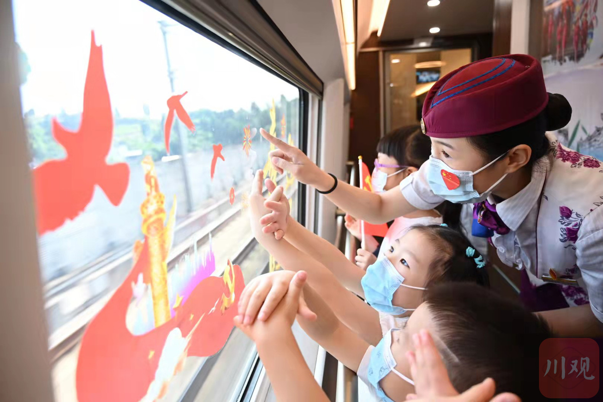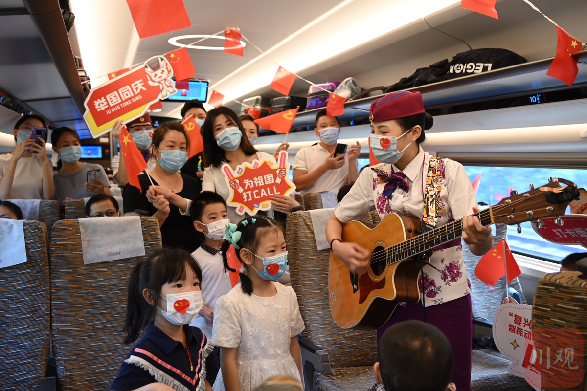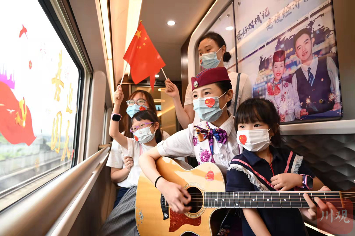 为庆祝“复兴号”智能动车组安全运行100天,当天,重庆客运段乘务组工作人员为乘坐G8612次旅客精心准备了一份惊喜。“动妹”们将列车装饰一番,贴上海报、窗花,旅客一上车,就感受到浓浓的国庆假期节日氛围,乘务员毛嘉吉他弹唱《我和我的祖国》,拉开列车活动序幕,引来不少乘客拍视频、发朋友圈。在成都工作的重庆人王女士就是其中一位。她说自己长期往返成渝两地,乘坐“复兴号”智能动车组,最大的感受就列车噪音很小,通过隧道时耳朵没有什么不适的感觉。
