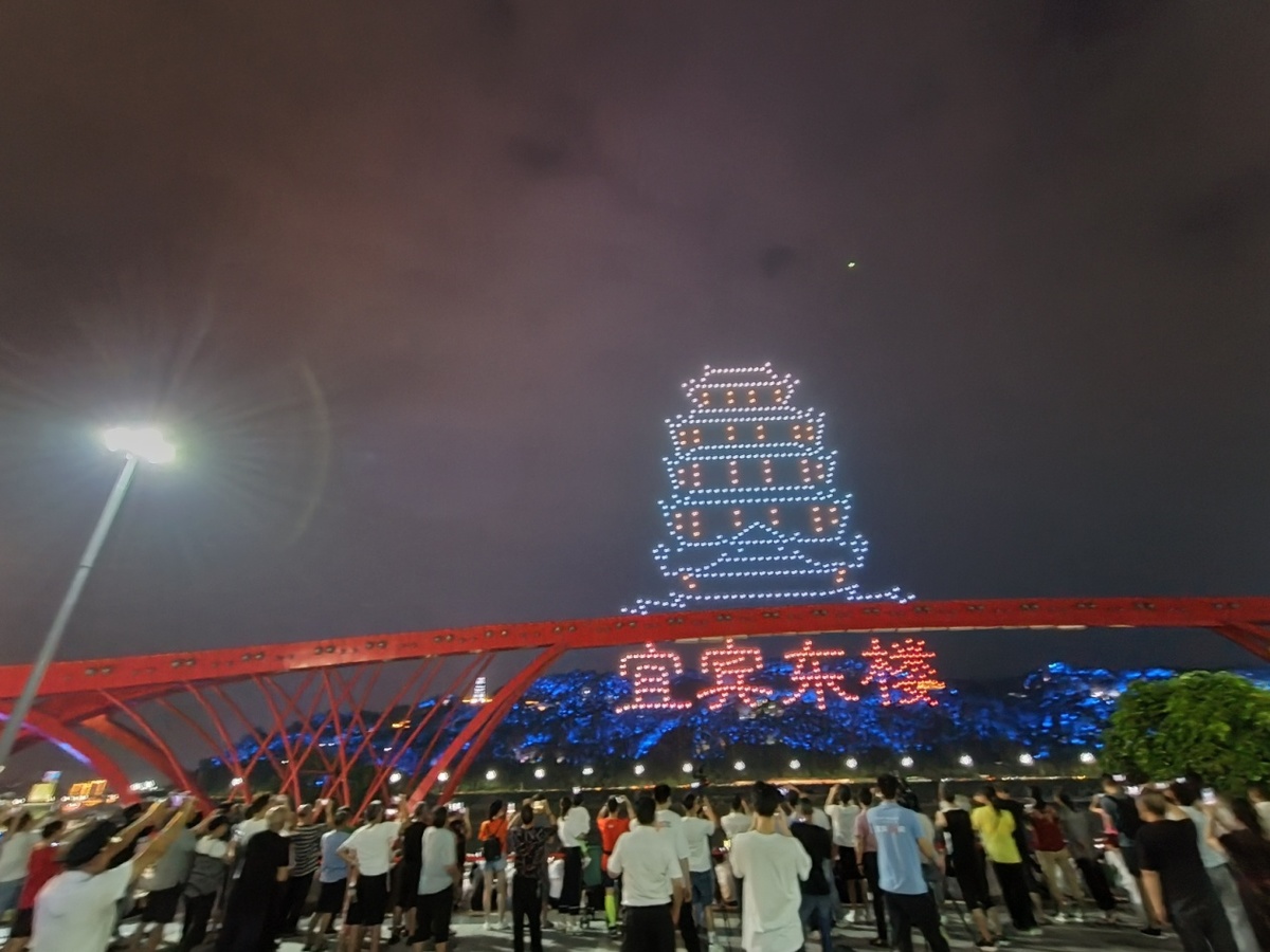 在宜宾,“科技+旅游” 600架无人机4场表演勾勒最美宜宾夜空。10月1日晚19点38分,宜宾市叙州区“庆国庆·颂赞歌”无人机表演开始,600驾无人机升空,勾勒最美宜宾夜空。这场秀以科技、艺术交融的手法擦亮了“万里长江第一城——宜宾”这张城市名片,为中华人民共和国72周岁生日献礼。当晚,600架智能无人机在金沙江、岷江和长江交汇的三江口上空进行了近20场编队表演,它们整齐划一地变换队形,在宜宾的夜空中呈现出长江首城·大美叙州、3D灯笼·国庆快乐、万里长江第一城、宜宾东楼等或平面、或立体的图案,吸引了大批市民和游客观赏、拍照留念。