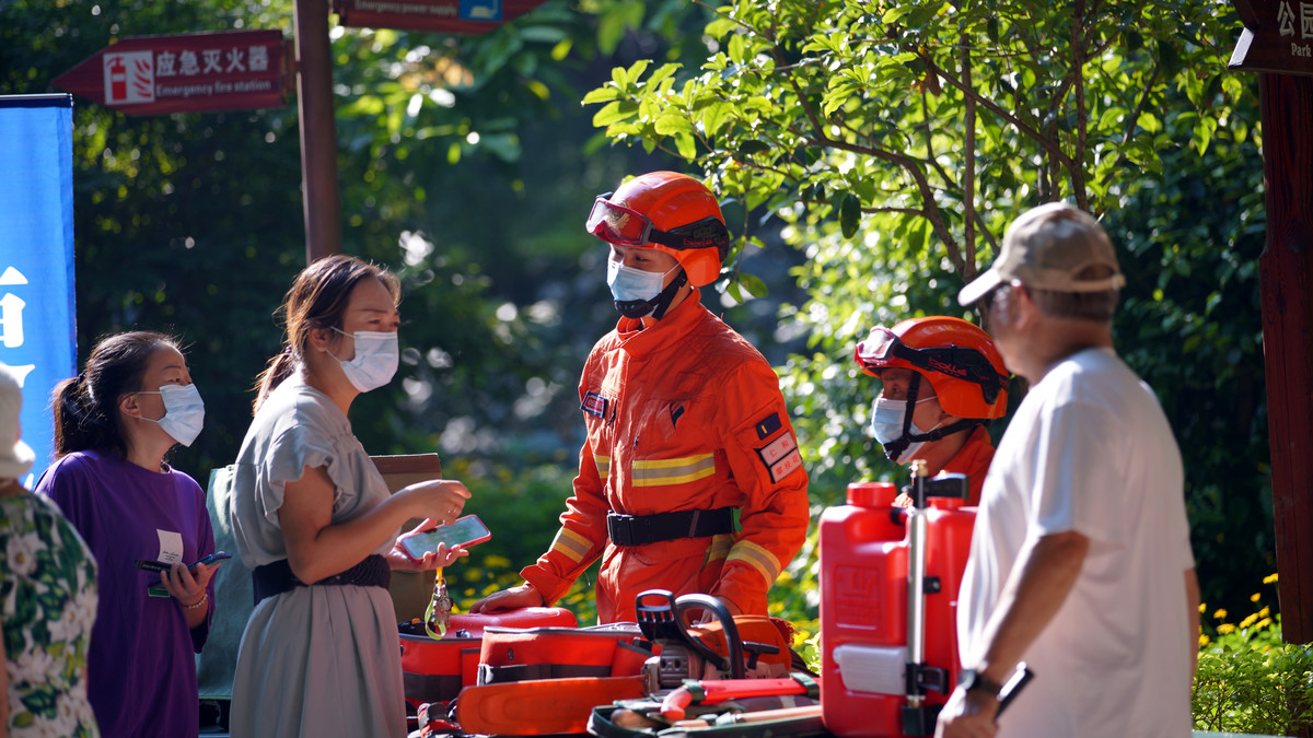 除了防火宣传,该支队还在攀枝花竹湖园公园内搭建了装备展示区,将风力灭火机、电动水枪、点火器、油锯等常规灭火装备,电动液压剪切器、水陆两栖破拆工具组、生命探测仪、抛投枪等特种救援装备进行操作演示,鼓励游客亲身体验,为游客手把手指导基本操作方法,进一步让游客加强对森林消防队伍的理解和认同。