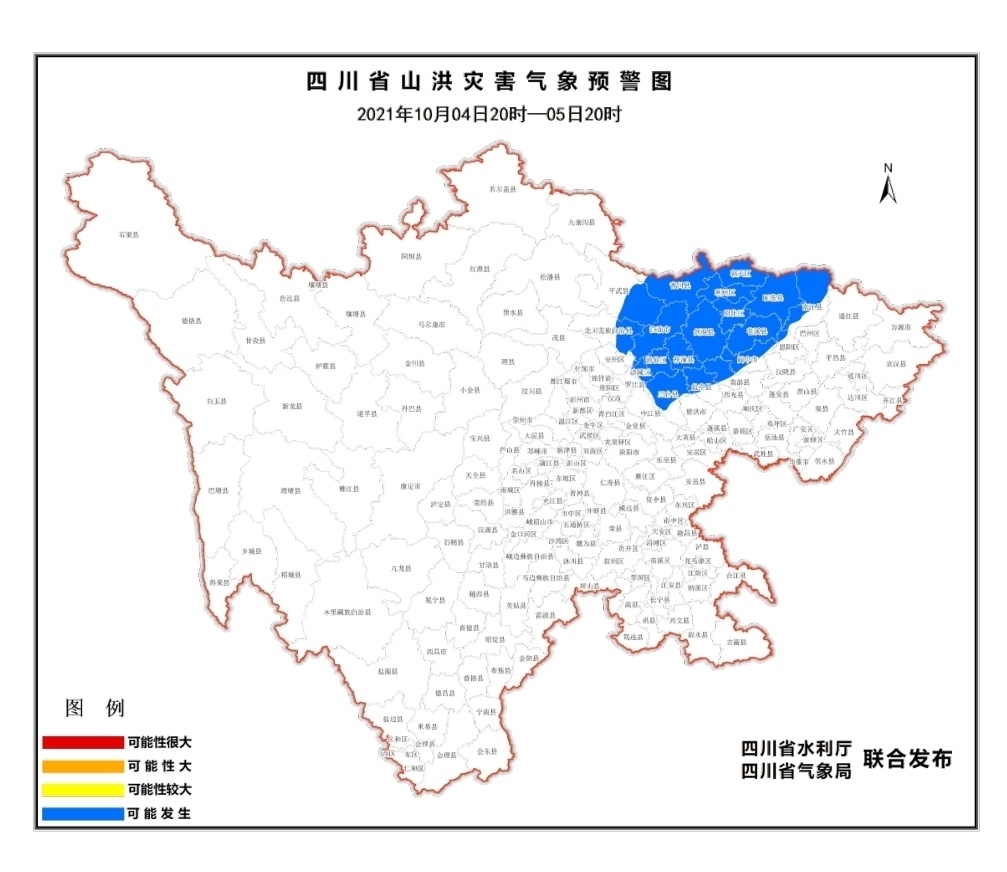 10月4日17时,四川省水利厅、四川省气象局联合发布山洪灾害蓝色预警。10月4日20时至5日20时,涪城、游仙、江油、梓潼、三台、盐亭、平武、北川、朝天、利州、昭化、青川、剑阁、旺苍、苍溪、恩阳、南江、阆中、南部等县(市、区)可能发生山洪灾害。