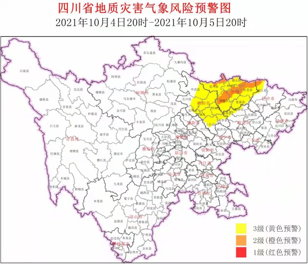 10月4日,四川省地质灾害指挥部办公室结合四川省气象台天气预报情况,发布地灾气象风险黄色预警,10月4日20时至10月5日20时:2市7县(区) 进入橙色预警范围;另有3市12县(市、区)进入黄色预警范围,预警等级较前一日升高。