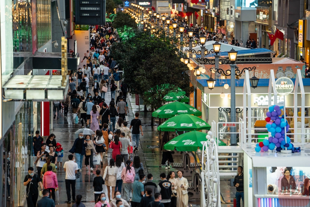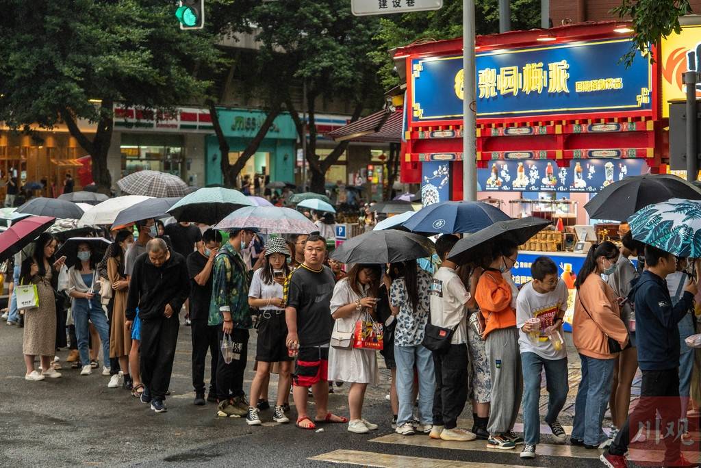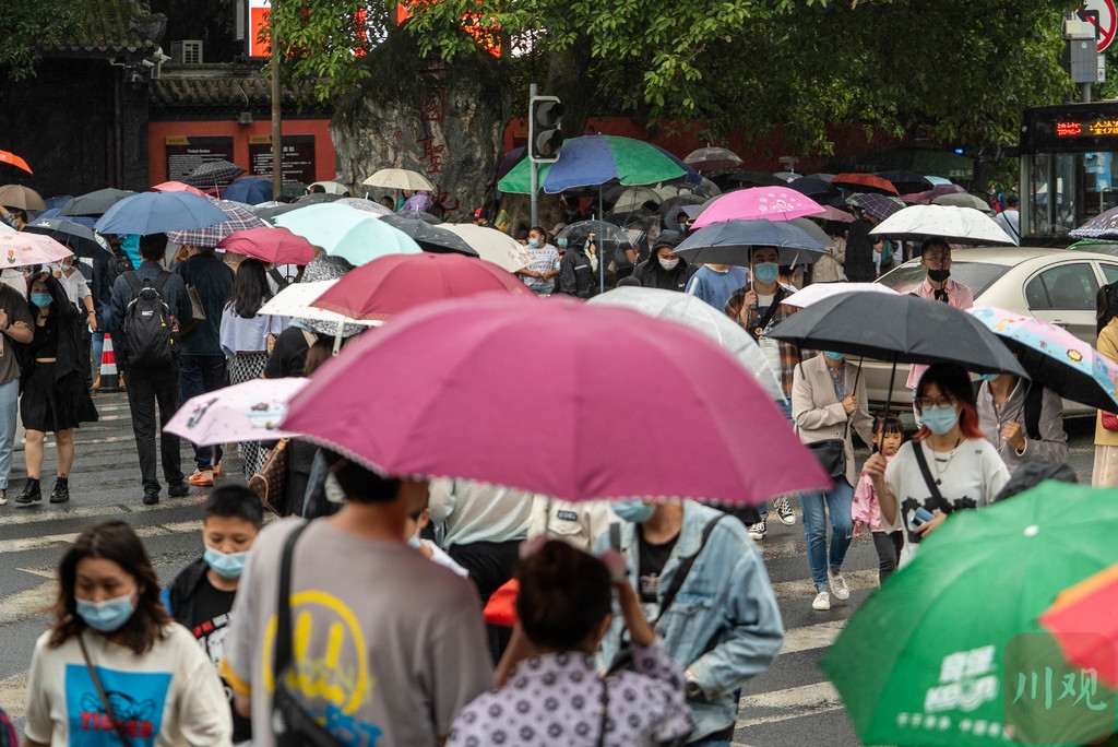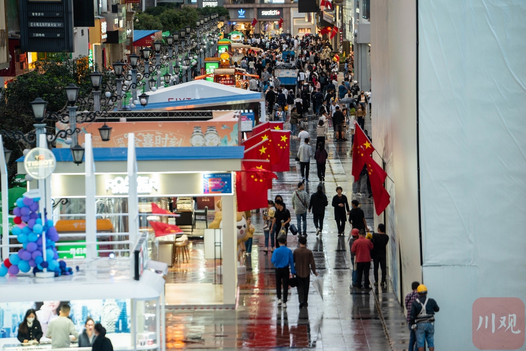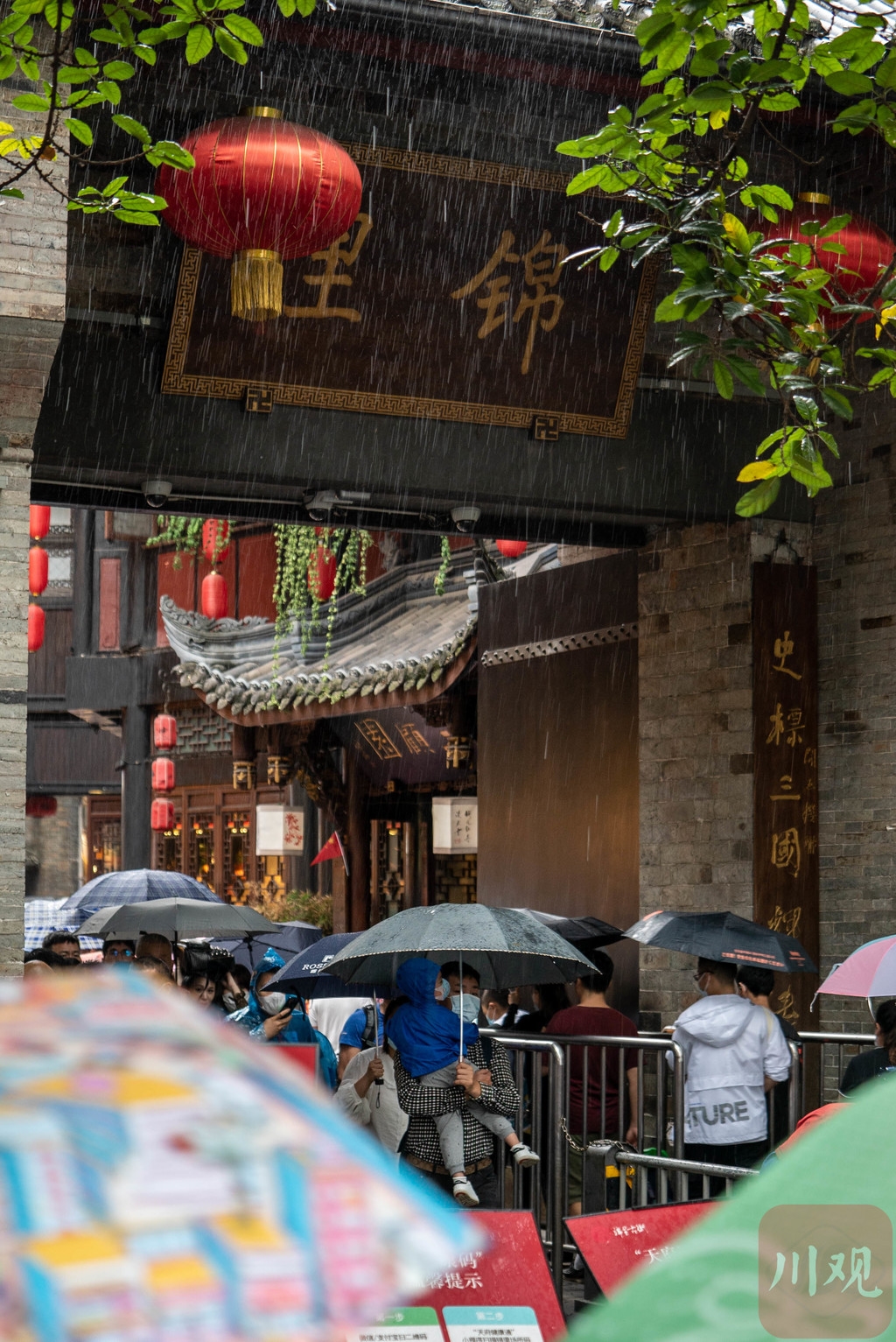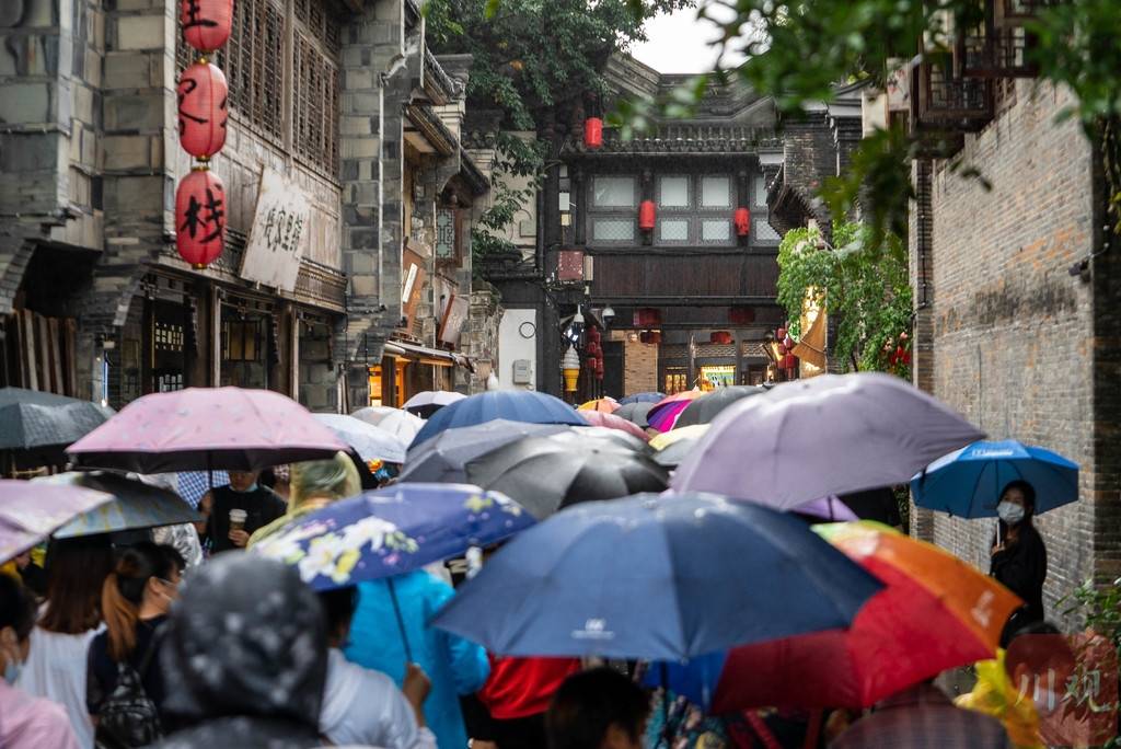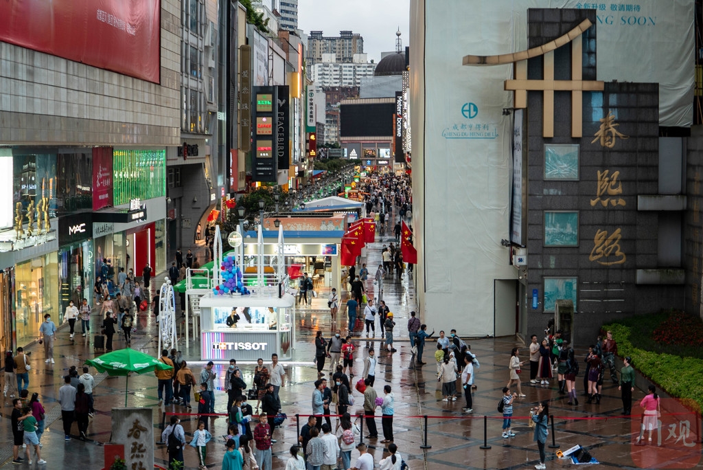 10月4日,国庆小长假第四天,成都迎来了断崖式降温,秋风萧瑟,秋雨淅淅沥沥的洒下来,气温降低了10℃左右。但这并没有影响到来蓉旅客游玩的激情,春熙路、建设巷、锦里古街等网红打卡地依然人头攒动。有的游客逛街购物、有的游客排队等待享受美食、有的游客则走进成都的古街老镇感受这里的文化气息,人来人往,络绎不绝。