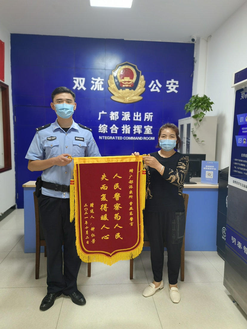 10月4日上午,成都市公安局双流区分局广都派出所民警曾亚东值班中,接到市民钟女士送来的感谢锦旗。“谢谢你小曾警官,国庆快乐!”钟女士笑着说。
