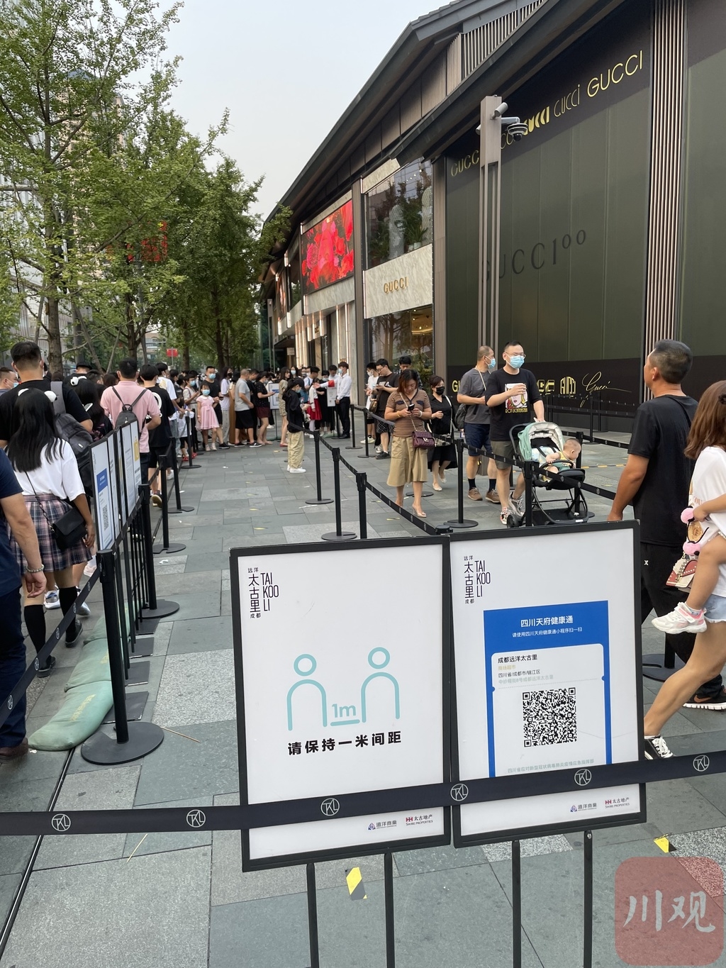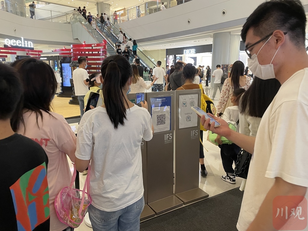 爬楼大熊猫的IFS成都国际金融中心,是不少游客的打卡地。10月5日下午3点,当记者来到这里时,密织的人流穿梭,人群中绝大多数都戴着口罩。沿着电动扶梯上行,记者看到,醒目的标示牌上提示着人们要出示健康码、扫场所码等。排队的人群自觉拿出手机进行着操作,尽管人流量大,但没有人抱怨或强行通过。从广元来的张先生告诉记者,非常理解和支持这样的做法,毕竟这是为了大家的健康。