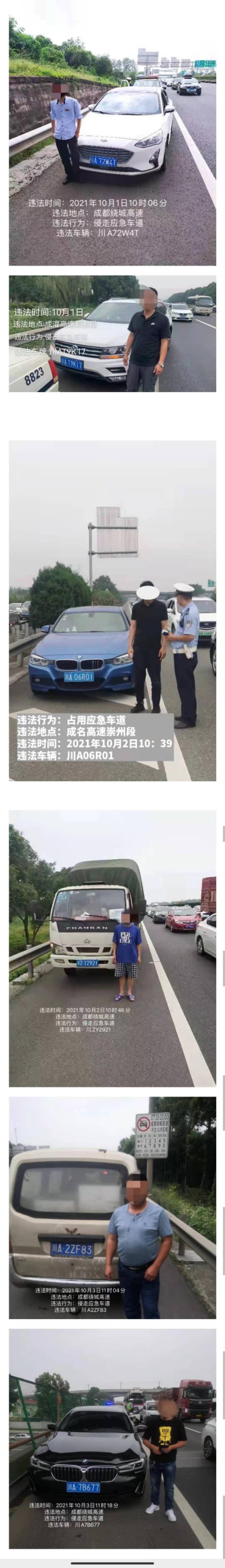 以上侵走应急车道的违法行为人都已受到200元罚款的行政处罚,驾驶证记6分。据了解,成都交警在市管高速设置多处电子眼设备,对各类交通违法行为进行抓拍,市民对发现的各类交通违法,也可以通过成都交警“蓉e行”微信公众号进行举报。
