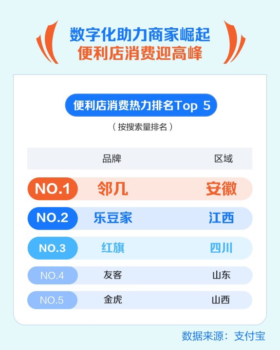 国庆期间,作为不少人假期消费的主要场景之一,便利店行业同样迎来集体爆发,安徽邻几便利店更是一举登上支付宝便利店搜索榜首,江西的乐豆家、四川的红旗、山东的友客和山西的金虎紧随其后。进店手机支付、扫码领券等数字化服务普及,让本土便利店发展迅速,更方便了国庆期间游客享受目的地生活服务。