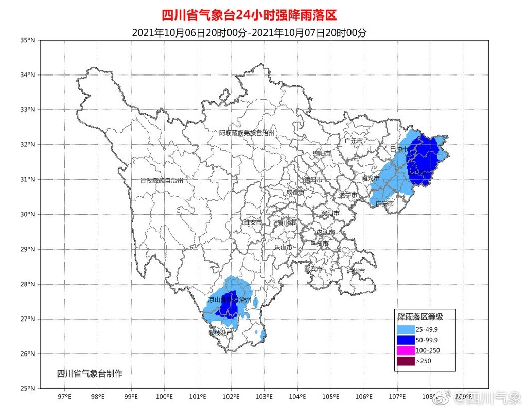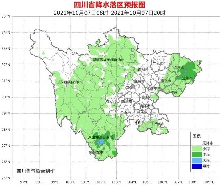 四川省气象台10月6日16时00分发布暴雨蓝色预警:6日20时到7日20时,达州大部、广安西部和巴中、南充2市东部有大雨到暴雨(雨量30~70毫米),局部雨量可达(80~120毫米);凉山州中部、攀枝花北部的部分地方有大雨到暴雨(雨量30~60毫米)。