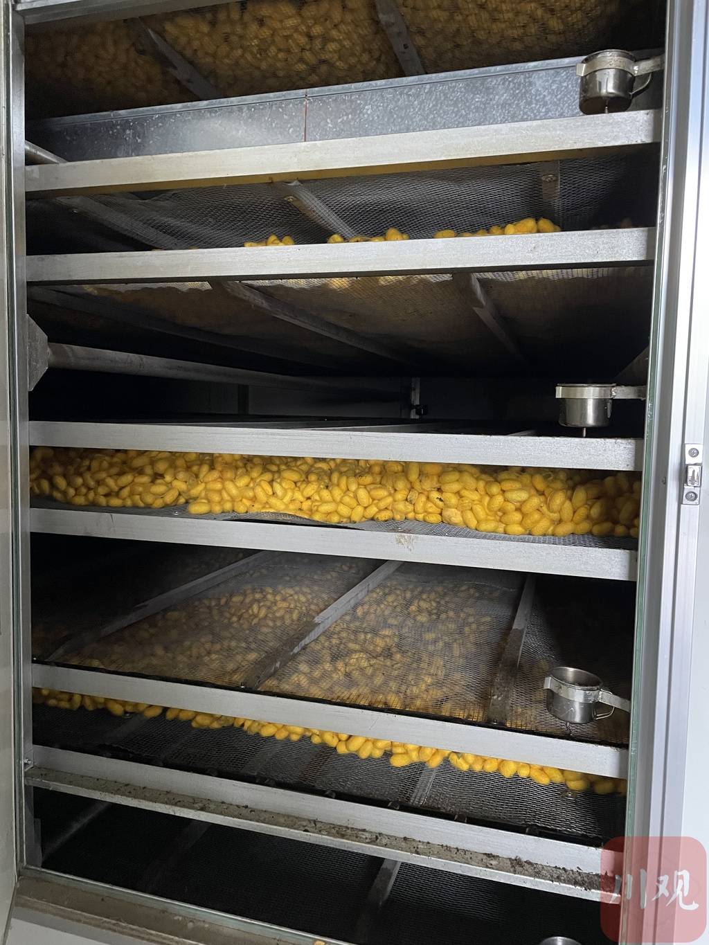 称重、计数、装筐、烘干……当天的烘干房内,黄金茧有条不紊地运转。“烘干是非常关键的一步,鲜茧必须马上烘干,并且烘干两次。”烘干机器占了整个房间的三分之一,王月霞说着打开机器的侧门,内部黄金茧“乖乖”分四层躺平,“每一层温度都不一样,要保证在蚕蛹化成蛾子之前,将茧子烘干,但是一次性温度又不能太高,以免蚕丝断头增多。”