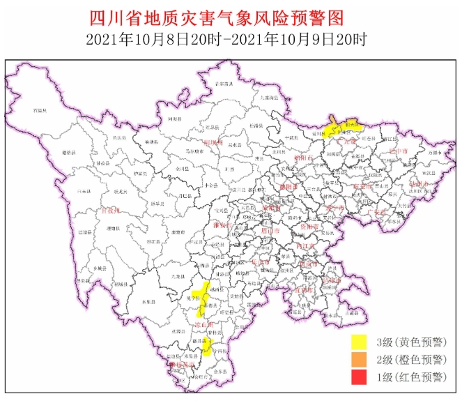 10月8日,四川省地质灾害指挥部办公室根据地质环境条件,结合四川省气象台天气预报情况,发布地灾气象风险黄色预警:10月8日20时至10月9日20时,广元利州区、朝天区、青川县,凉山州西昌市、会理市、德昌县、宁南县、普格县、喜德县、冕宁县、越西县等2市(州)11个县(市、区)进入预警范围。