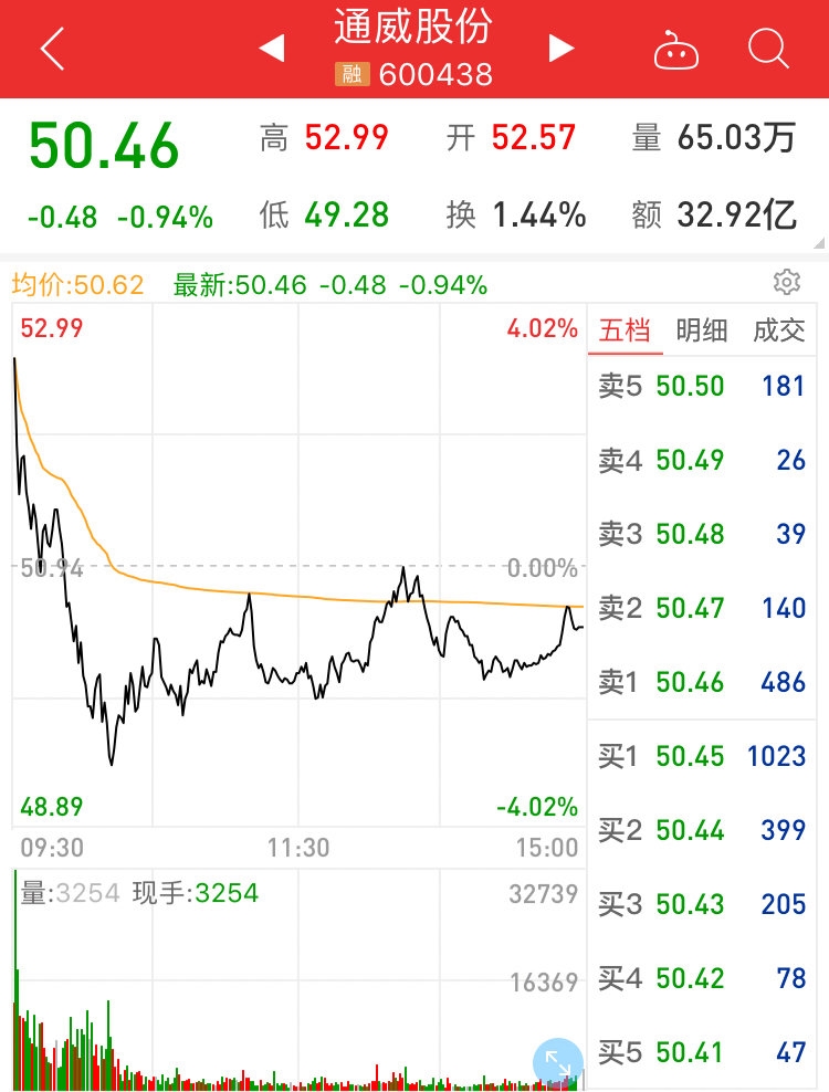 截至收盘,通威股份报50.46元,微跌0.94%。