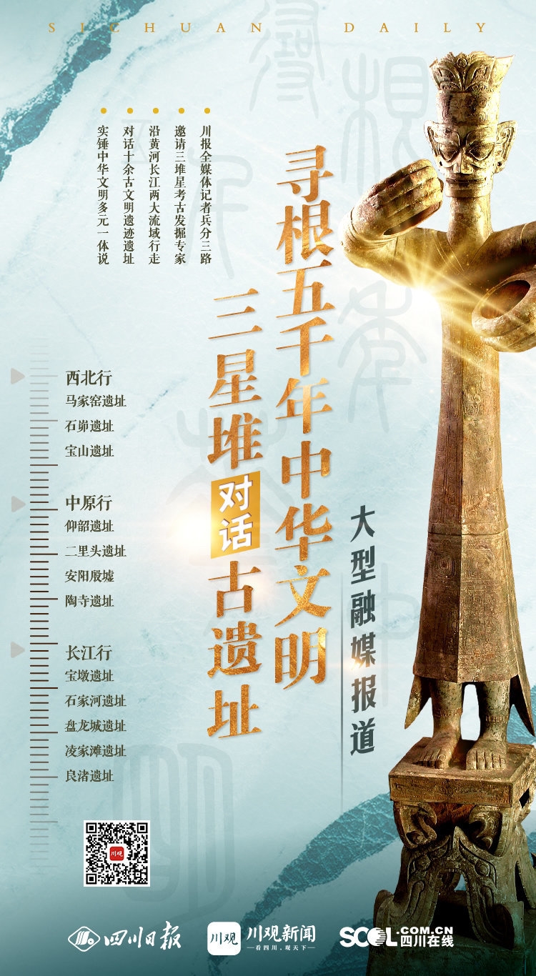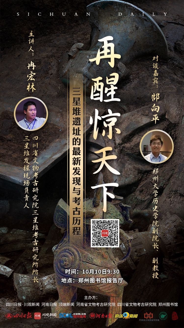 10月10日9:30,四川日报全媒体将联合河南日报、顶端新闻、 河南省文物考古研究院、四川省文物考古研究院、郑州图书馆共同在郑州图书馆举办一场古蜀文明与中原文明的对话。四川省文物考古研究院三星堆考古研究所所长、三星堆发掘现场负责人冉宏林,讲述三星堆遗址的最新发现与考古历程,并与郑州大学历史学院副院长、副教授郜向平展开对谈。届时,四川日报全媒体将进行全网直播。