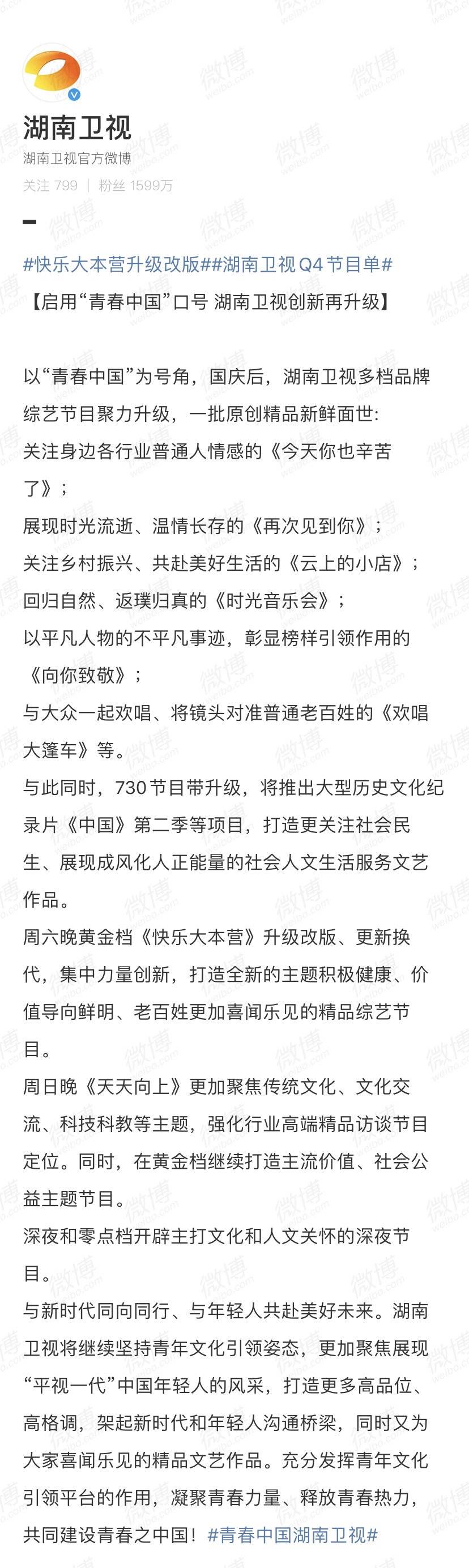 10月9日,原本每周六晚播出的湖南卫视老牌综艺节目《快乐大本营》并未在当晚将播出的节目表中,引发不少网友关注。对此,湖南卫视官方微博发文回应,节目将改版升级。