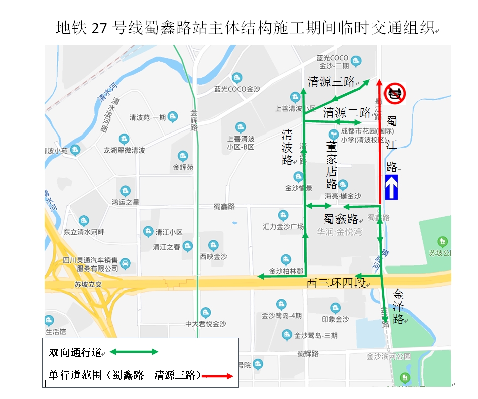 一、2021年10月14日至2022年10月14日,蜀鑫站主体结构施工,蜀江路(蜀鑫路至清源三路)实行机动车由东向西单向通行(含公共汽车)。行人、非机动车在确保安全的前提下谨慎通行。