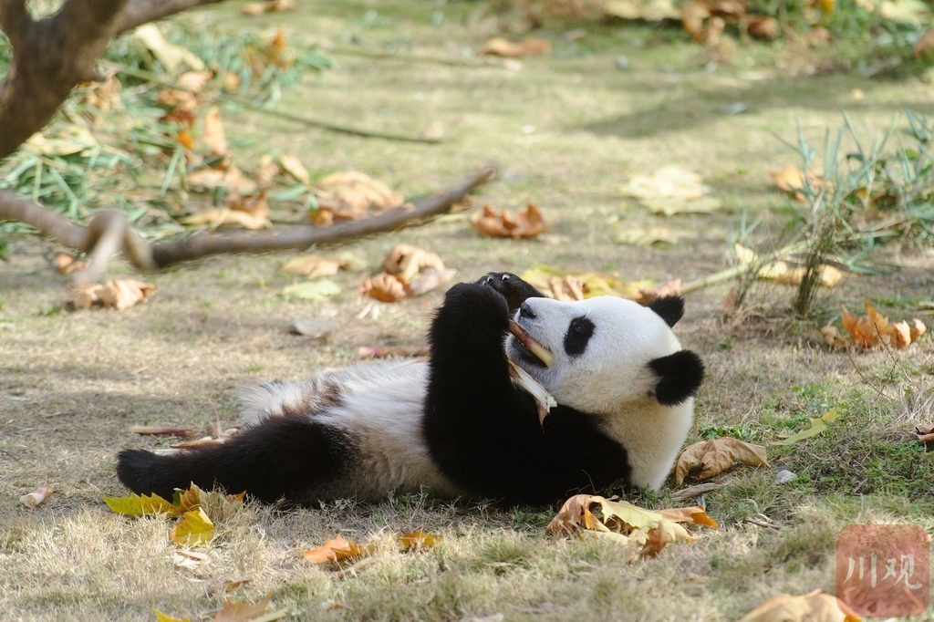 一只“吃货”滚滚,躺在地上进食。 四川在线记者 杨树 摄
